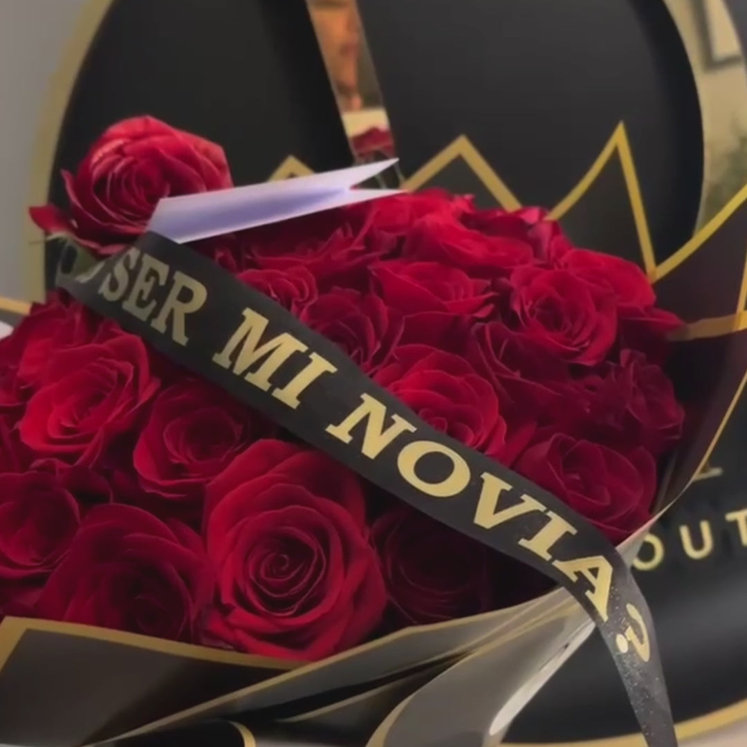 Rosa sopresa, listón (Quieres ser mi novia) y tarjeta dedicatoria de obsequio.